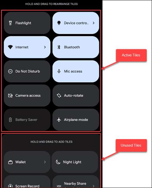 Dlaždice nahoře jsou v aktivní oblasti. To jsou ty, které vidíte, když rozbalíte rychlé nastavení. V dolní části, které lze přidat více dlaždic, včetně "přístupu k fotoaparátu" a "MIC Access".