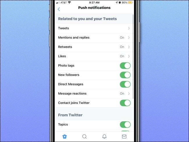 Na stránce Push Oznámení je snadné přizpůsobit přesně jaký typ oznámení, které chcete přijímat od aplikace Twitter. Můžete například vybrat pouze pro příjem pouze oznámení, pokud lidé odpoví na vaše tweety nebo vypnout oznámení týkající se nových následovníků.