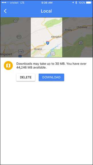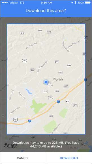 Mapy pro vás automaticky vyberou malou oblast, ale můžete ji přiblížit a přiblížit a uložit tak velkou oblast, jak chcete. zaznamená si, kolik místa bude oblast zabírat, takže na to pamatujte také. Až se usadíte v přijatelné oblasti, klepněte na tlačítko stahování. pokud nepoužíváte Wi-Fi, budete muset stahování přes mobilní síť schválit.