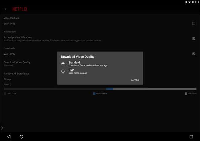 Jak pravděpodobně předpokládáte, Standard zabírá méně místa, kde High sní více. Na svém Pixel C jsem mohl rozhodně viz pixelace a artefakty s nastavením „Standardní“, ale věci se dost vyčistily pomocí „Vysokého“. Jdu ven na končetinu a hádám, že druhá je 720p, ale neexistuje žádná dokumentace, která by to přímo uváděla.