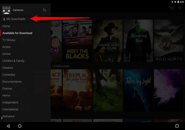 Chcete-li získat přístup ke staženému obsahu, otevřete nabídku (znovu zasuňte zleva) a vyberte možnost „Moje stažené soubory“.