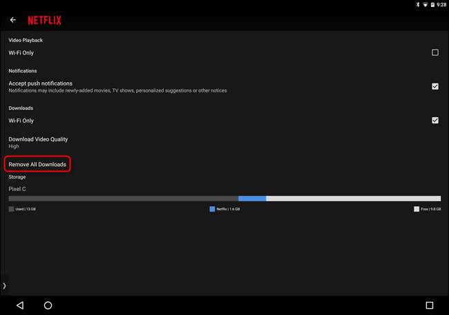 Pokud chcete odebrat veškerý stažený obsah, můžete přejít zpět do nabídky Nastavení posunutím zleva dolů a přejetím dolů na „Nastavení aplikace“ a potom klepnutím na tlačítko „Odstranit všechna stahování“.
