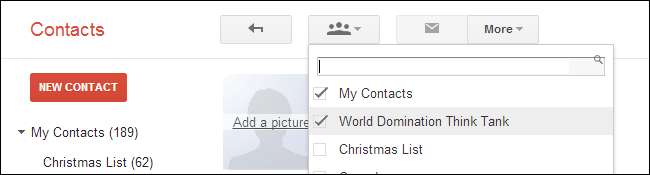 Bez ohledu na to, zda jej používáte, je k vašemu účtu Gmail připojen účet Kontakty Google. Odtud Gmail stahuje návrhy automatického dokončování e-mailových adres. Chcete-li vytvořit svůj seznam adres, musíte nejprve navštívit svůj účet Kontakty Google a seskupit lidi, kterým chcete poslat e-mail.