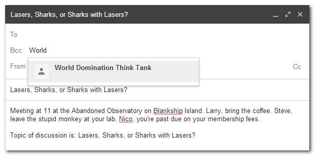 Jedna věc, kterou si možná všimnete, je, že jsme umístili naši zkratku skupiny do slotu BCC. Pokud neposíláte e-mailem malou skupinu lidí, kteří výslovně spolupracují a potřebujete mít možnost poslat e-mail zpět celé skupině (nebo jiným členům skupiny), nepoužívejte slot TO nebo CC, použijte BCC. BCC je obzvláště důležité, pokud posíláte e-mailem skupině lidí, kteří pro všechny účely navzájem nesouvisí (například posíláte e-mail rodičům všech dětí, které doučujete, abyste jim připomněli, že nebudete během jarních prázdnin). Můžete si přečíst o použití CC a BCC v Vysvětlení HTG: Co je BCC a proč jste hrozný člověk, pokud jej nepoužíváte správně (nebo vůbec) .