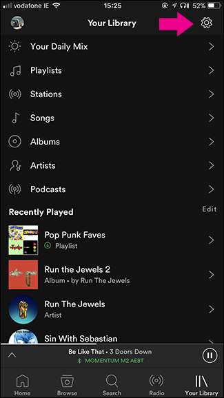 Pokud používáte iPhone, otevřete Spotify a přejděte na kartu Vaše knihovna. Klepněte na ikonu ozubeného kola v pravém horním rohu a poté vyberte Přehrát.