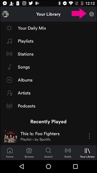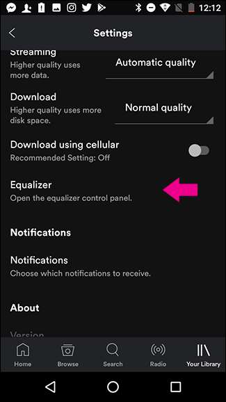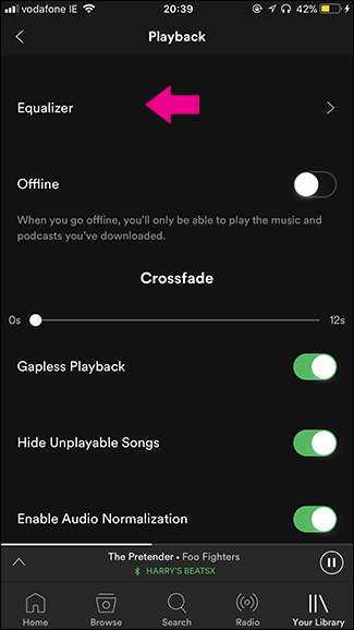 V systému Android otevřete Spotify a klepněte na ikonu ozubeného kola v pravém horním rohu. Přejděte dolů a vyberte možnost Ekvalizér.