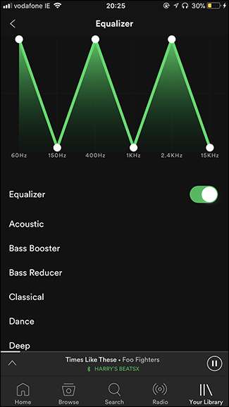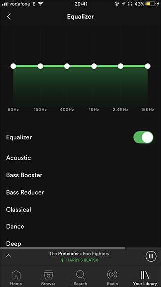 Pokud se nechcete trápit s vytáčením ve svém vlastním nastavení ekvalizéru, nebo si chcete jen usnadnit práci, můžete také vybrat jednu z předvoleb Spotify. Tito jsou pojmenováni buď podle jejich funkce (např. Bass Booster nebo Bass Reducer) nebo podle druhu hudby, pro kterou nejlépe fungují (např. Rock nebo Classical). Stačí klepnout na předvolbu a použít ji.