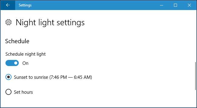 Po povolení Windows automaticky nastaví plán pro noční světlo. Windows aktivuje noční světlo od západu slunce do východu slunce a tyto časy automaticky upravuje tak, aby zůstaly synchronizované s pohyby slunce ve vaší zeměpisné poloze.