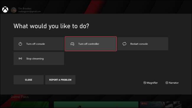 Nejjednodušší způsob, jak baterie v regulátoru trvat déle, je jednoduše vypnout, pokud je nepoužíváte. To lze provést ručně na jakémkoli místě při hraní hry: stiskněte a podržte tlačítko Xbox ve středu regulátoru, pak zvolte „Vypnout Controller.“