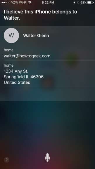 Doufejme, že pokud jste našli iPhone, majitel byl dostatečně chytrý přepněte telefon do ztraceného režimu pomocí aplikace Najít můj iPhone . Pokud ano, jejich kontaktní informace se zobrazí přímo na uzamčené obrazovce s odkazem na volání na jakékoli telefonní číslo, které nastavili. Pokud ne, Siri vám přijde na pomoc.