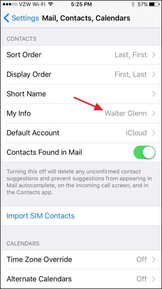 Doufejme, že majitel byl dopředu přemýšlel natolik, aby zahrnoval dostatek kontaktních údajů, aby se dostal do kontaktu. A pokud vlastníte iPhone, je to něco, co stojí za to udělat sami. Pokud nechcete, aby se vaše úplné kontaktní údaje zobrazovaly komukoli, kdo náhodou najde váš telefon, zvažte nastavení dalšího kontaktu s dostatečnými informacemi pro kontaktování někoho, kdo váš telefon najde, a poté z něj udělejte kontakt na vlastníka. Chcete-li to provést, přejděte do Nastavení> Pošta, Kontakty, Kalendáře, klepněte na Moje informace a vyberte nový kontakt.