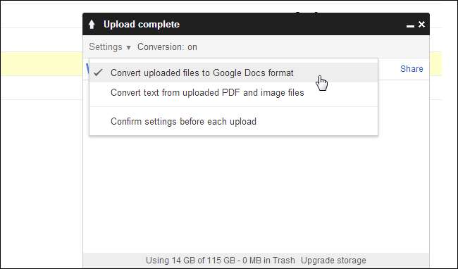 Můžete také povolit možnost „Převést nahrané soubory do formátu Dokumentů Google“ v dialogu nahrávání, aby se nové dokumenty automaticky převáděly. Pokud tak učiníte, můžete přijít o některé pokročilé formátování.