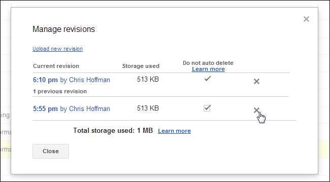 Chcete-li zkontrolovat předchozí verze, klikněte pravým tlačítkem na soubor a vyberte Spravovat revize. Kliknutím na tlačítko X odstraníte předchozí verzi a uvolníte místo.