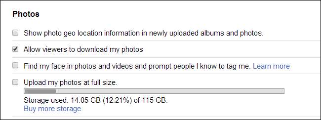 Chcete-li určit, co se stane, když nahrajete fotky do Fotek Google+ z webu, otevřete vaše stránka nastavení Google+ , přejděte dolů na Fotky a zkontrolujte, zda je zaškrtnuto „Nahrát moje fotografie v plné velikosti“. Pokud tato možnost není zaškrtnuta, fotografie, které nahrajete pomocí prohlížeče, se automaticky zmenší a nespotřebovávají žádný úložný prostor. Pokud zaškrtnete tuto možnost, budete mít větší fotky archivované online, ale budou se započítávat do vaší kvóty úložiště.