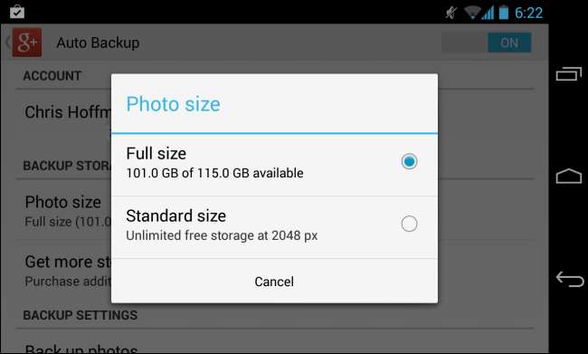 Pokud používáte aplikaci Google+ v telefonu Android a máte ji nastavenou na automaticky nahrajte pořízené fotografie do svého účtu Google+ , zjistíte, že ve výchozím nastavení automaticky nahrává fotografie v režimu plné velikosti a spotřebovává úložný prostor. Pokud chcete, aby aplikace nejprve zmenšila fotografie na standardní velikost, aby je bylo možné bezplatně uložit, otevřete aplikaci Google+ v telefonu, přejděte do Nastavení, klepněte na Automatické zálohování a klepněte na možnost Velikost fotografie. Vyberte požadovanou velikost fotografie.