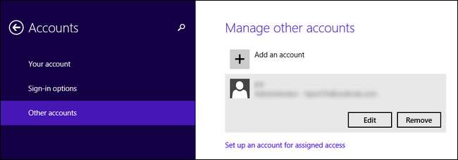 Přihlaste se k místnímu uživatelskému účtu a opakujte postup, kterým jsme tutoriál zahájili. Pomocí poplatku za vyhledání vyhledejte „uživatele“, klikněte na „Přidat, odstranit a spravovat účty jiných uživatelů“. Nyní, když jste přihlášeni k místnímu uživatelskému účtu, se účet Microsoft zobrazí v části „Jiné účty“, klikněte na danou kategorii a poté dvakrát klikněte na položku pro účet Microsoft: