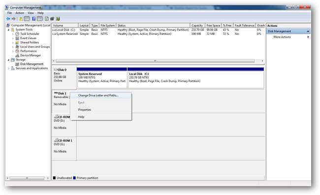 Když se otevře konzola pro správu disků, vyhledejte ve spodní části modulu snap-in jednotku, kterou chcete skrýt. Klikněte na něj pravým tlačítkem myši az kontextové nabídky vyberte možnost Změnit písmeno jednotky a cesty ..