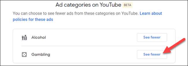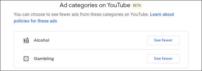 V současné době jsou zde dvě kategorie (s více potenciálně přichází v budoucnu): "alkohol" a "hazardní hry". Klikněte na "vidět méně" vedle typů reklam, které již nechcete vidět.