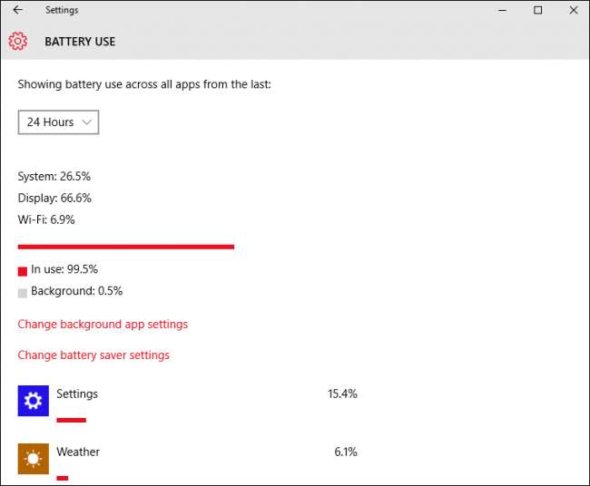 Chcete-li změnit, které aplikace mohou běžet na pozadí, klepněte nebo klikněte na odkaz „Změnit nastavení aplikace na pozadí“. Aplikace na pozadí mohou „přijímat informace, odesílat oznámení a mít aktuální informace, i když je nepoužíváte“, takže pokud zde něco, co nepoužíváte, je nejlepší klepnout na „Vypnuto“, takže to není zbytečně nespotřebovávejte baterii.