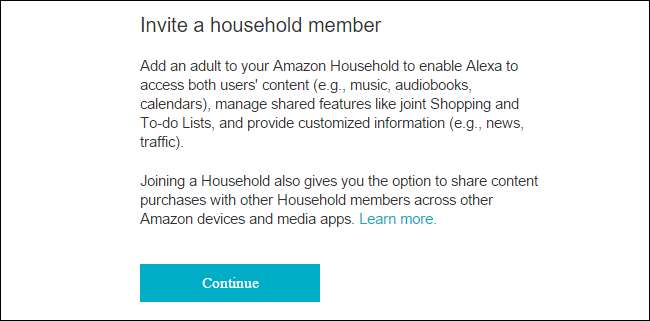 Po ověření jejich přihlašovacích údajů jim bude předložen souhrn zkušeností se sdílením Amazon Echo / Alexa, které procházejí vším, co bude sdíleno (hudba, audioknihy, kalendáře i společné úkoly a nákupní seznamy). Po přečtení shrnutí a informací o zpracování hlasu a sběru dat Alexa dokončete proces výběrem možnosti „Připojit se k domácnosti“. Uvidíte potvrzovací proces, který vás přivítá v domácnosti držitele primárního účtu.