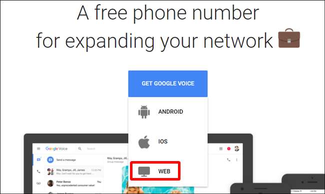 Chcete-li to nastavit, přejděte na Domovská stránka Google Voice na počítači a začněte kliknutím na „Získat Google Voice“. Když se zobrazí rozbalovací nabídka, klikněte na „Web“ (samozřejmě za předpokladu, že to děláte z počítače).