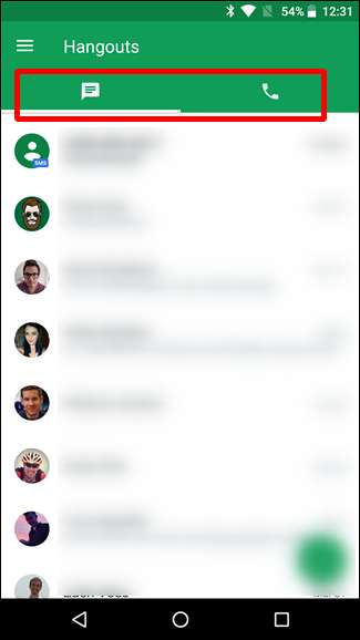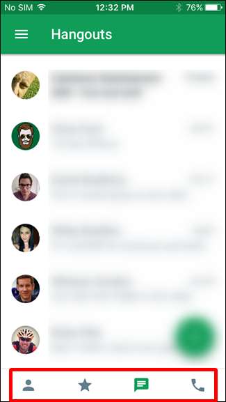 Pokud jste dříve používali službu Hangouts, rozhraní již znáte. V systému Android existují dvě karty: jedna pro zprávy a druhá pro hovory (která je k dispozici pouze po nainstalování Vytáčení Hangouts). V systému iOS jsou karty podél spodní části a existují čtyři: Kontakty, Oblíbené položky, Zprávy a Hovory.
