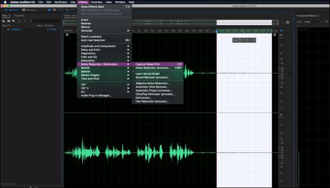 V Audition budete muset nejprve použít šumový tisk, než budete moci použít redukci šumu. Vyberte tichý bit zvuku a vyberte Efekty> Potlačení šumu> Zachytit tisk šumu.