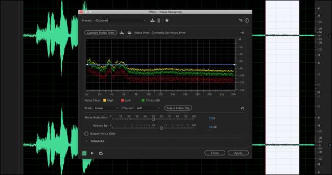Redukci šumu můžete provést mnoha různými způsoby, ale jeden z nejlepších používá k selektivnímu odstranění šumu něco, co se nazývá hlukový tisk, a je užitečné pro všechny druhy šumu. Existuje mnoho dalších efektů, jako je odstraňovač syčení, které můžete použít ke zmírnění různých frekvencí, a adaptivní redukce šumu, která nepotřebuje šumový tisk.