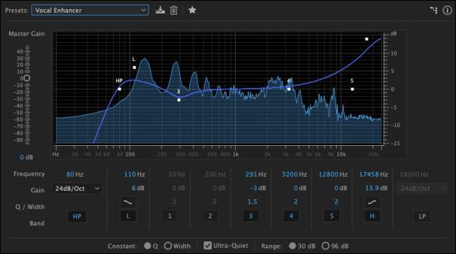 Předvolba „Vocal Enhancer“ v Audition bude pravděpodobně nejlepší. Tato předvolba omezuje velmi nízké basy a zvyšuje frekvence, kde obvykle existují vokály. Toto okno můžete otevřít v části Filtr a EQ> Parametrický ekvalizér. Stejně jako redukce šumu musíte vybrat část zvuku do EQ a můžete si prohlédnout náhled změn pomocí tlačítka „Přehrát“.