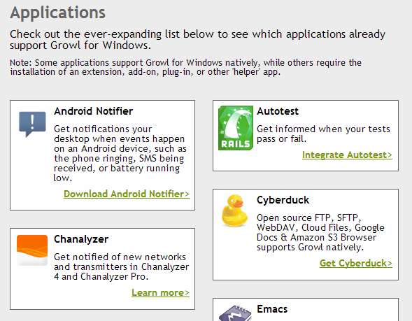 Existují některé aplikace, které Growl podporuje přímo z krabice, ale existují i jiné, pro které je vyžadován plugin. Navštivte návštěvu stránka kompatibility aplikací abyste zjistili, které z vašich programů mohou využívat Growl.