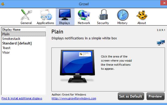 Přesun na kartu Displeje si můžete prohlédnout, jak vypadají různé styly oznámení. Existuje několik integrovaných možností, ale více stylů lze stáhnout kliknutím na odkaz „Najít a nainstalovat další displeje“ v dolní části dialogového okna.