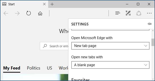 „Úvodní stránka“ Edge vždy zobrazí informační kanál, když otevřete nové okno Edge. Chcete-li skrýt zdroj při spuštění Edge, klikněte na pole „Otevřít Microsoft Edge s“ a vyberte „Stránka Nová karta“. Můžete také vybrat „Předchozí stránky“, chcete-li znovu otevřít jakékoli stránky, které jste otevřeli před zavřením Edge, nebo „Konkrétní stránku nebo stránky“, chcete-li, aby Edge otevřel jednu nebo více konkrétních webových stránek.