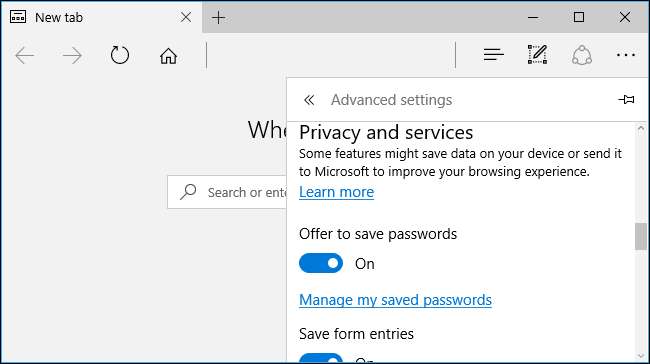 - Nabídněte uložení hesel : Edge nabídne uložení hesel a jejich synchronizaci ve výchozím nastavení, ale můžete tuto možnost deaktivovat a Edge hesla neuloží. V každém případě budou synchronizovány mezi vašimi zařízeními, pouze pokud máte povoleno nastavení synchronizace „Hesla“. Pokud tuto možnost deaktivujete, Edge uloží uložená hesla pouze do vašeho počítače.