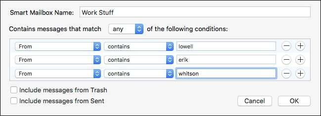 Dále je čas vybudovat naše pravidlo, které funguje podobně jako u skutečných pravidel služby Mail . Aby toto pravidlo fungovalo správně, musí zprávy odpovídat „jakékoli“ stanovené podmínce. Toto konkrétní pravidlo je snadné, vše, co děláme, je vytváření poštovní schránky, kde lze najít zprávy „od“ pracujících. Tímto způsobem nemusíme tyto zprávy prohledávat v naší doručené poště ani je přesouvat.