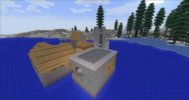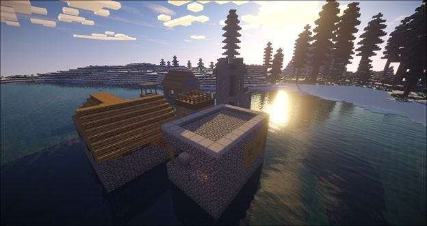 Pojďme se podívat, jak načíst SEUS a jaký je v tom rozdíl. Tady je veselá vesnička, kterou jsme objevili v jezeře. Celá ta voda bude vypadat sakra dobře, když přejdeme k používání shaderů, tak si to vyzkoušíme.