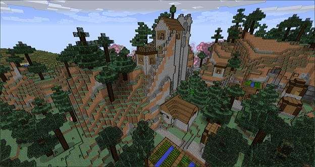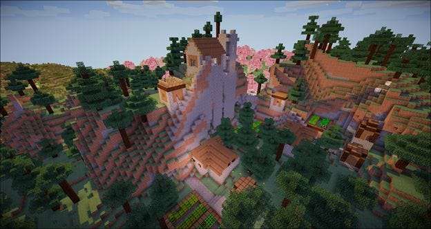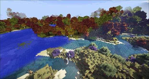 Pojďme se rozletět v kreativním režimu a pořídit několik srovnávacích snímků. Jediné mody, které jsme načetli kromě Shaders Mod a SEUS, jsou Biomes O ‘Plenty a Mo‘ Villages (pro tento test shaderu používáme stejný svět, který jsme použili v lekci 6 k předvedení těchto dvou světově se rozšiřujících modů).