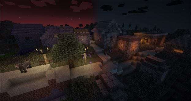Noční scény jsou obzvláště skvělé díky použitému mohutnému shaderu. Ve vesnici nahoře vidíte nativní shader vlevo a shader SEUS vpravo. Světlo je ve shaderu SEUS mnohem teplejší a únik světla a případné stíny jsou mnohem realističtější.