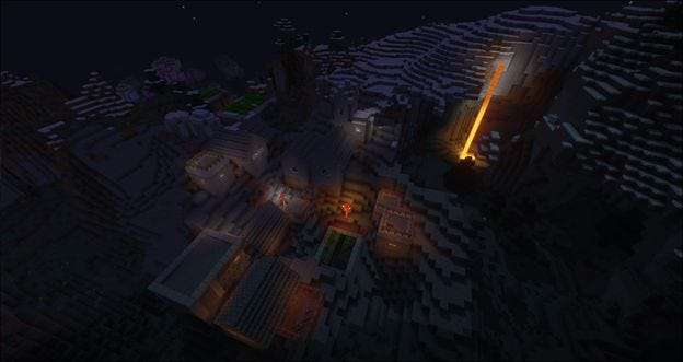Tento snímek ukazuje horskou vesnici (s laskavým svolením Mo 'Villages). Levá polovina obrázku ukazuje chladné bílé spektrum osvětlení a červenou lávu s bílým osvětlením, které poskytuje výchozí shader. Pravá polovina obrázku ukazuje, jak teplá vesnice vypadá pomocí shaderu SEUS a jak silně svítí láva.