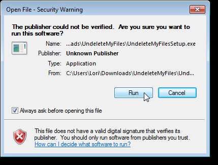 Poklepáním na soubor .exe nainstalujte UndeleteMyFiles Pro. Pokud Otevřít soubor - bezpečnostní varování Zobrazí se dialogové okno, klepněte na Běh pokračovat v instalaci.