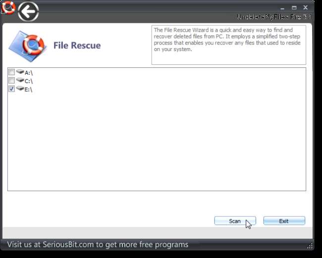 Na obrazovce File Rescue vyberte písmeno jednotky pro jednotku, která obsahovala odstraněný soubor, a klikněte na Scan.