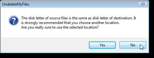 Pokud vyberete složku na stejné jednotce, na které byl odstraněný soubor umístěn, zobrazí se varování. Obnovený soubor se doporučuje uložit na jiný pevný disk než ten původní.