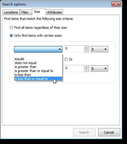 Chcete-li určit konkrétní velikost souboru, který chcete obnovit, klikněte na kartu Velikost a vyberte přepínač Pouze najít položky s určitými velikostmi. Vyberte možnost z prvního rozevíracího seznamu vlevo, abyste určili velikost, kterou určíte. Zadejte velikost do editačního pole a vyberte možnost z rozevíracího seznamu vpravo, abyste určili, zda je zadaná velikost v bajtech (B), kilobajtech (KB), megabajtech (MB) nebo gigabajtech (GB).