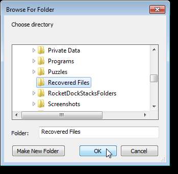 Zobrazí se dialogové okno Procházet složku. Vyberte adresář, do kterého chcete uložit obnovené soubory, a klikněte na OK.