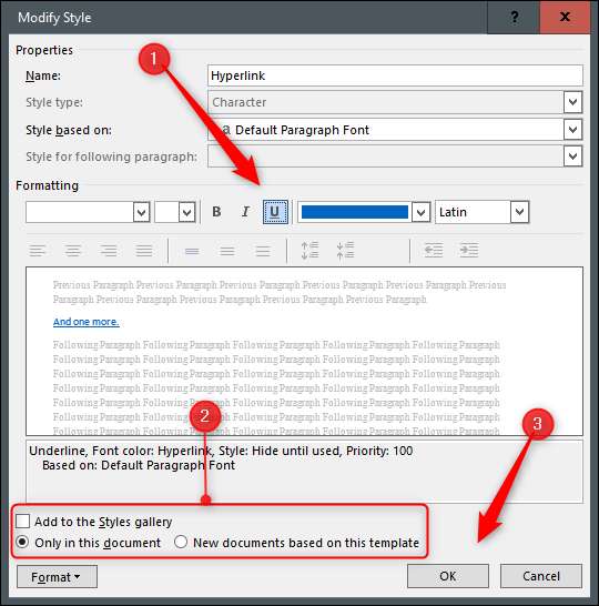 Nyní budete v okně "Upravit styl", což je místo, kde můžete formátovat styl hypertextového odkazu. Kliknutím na ikonu podtržení zrušíte ji.