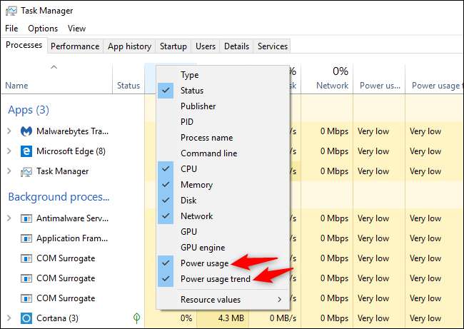Tyto informace se zobrazují v podokně Procesy, ale jsou skryty malou velikostí okna. Zvětšete okno kliknutím a tažením v rohu, dokud se nezobrazí sloupce Využití energie a Trend využití energie, nebo se posuňte doprava. Můžete také přetáhnout záhlaví a změnit pořadí sloupců.