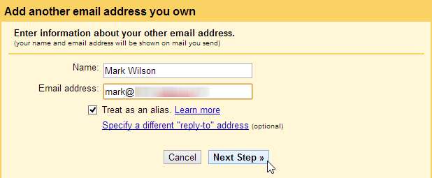 V sekci „Odeslat poštu jako“ klikněte na odkaz „Přidat další e-mailovou adresu, kterou vlastníte“. Zadejte e-mailovou adresu, ze které chcete odesílat, a poté klikněte na Další krok.