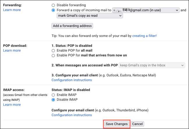 Vyberte „/ IMAP Přeposílání a protokol POP“ kartu ve vašem nastavení. V horní části této sekce, označená Forwarding, je oblast, která budete pracovat. Klikněte na „Přidat přesměrování adresy.“