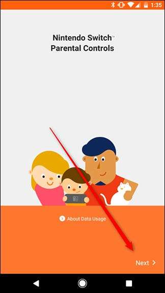 Při prvním otevření aplikace klepněte na Další (můžete také klepnout na O využití dat, pokud chcete deaktivovat analytické sledování Nintendo). Poté klepněte na Přihlásit / Vytvořit účet do propojte svůj účet Nintendo .