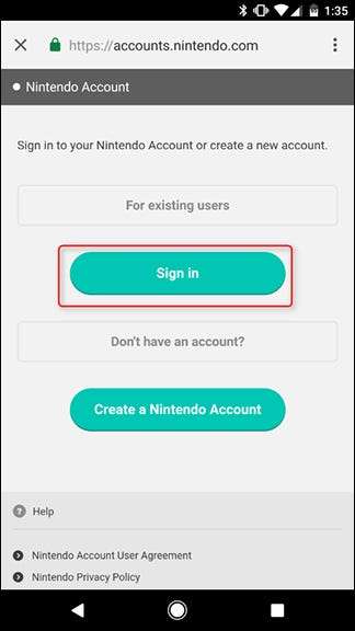 Klepnutím na „Přihlásit“ se přihlaste ke stávajícímu účtu nebo klepnutím na „Vytvořit účet Nintendo“, pokud jej nemáte. Předpokládáme, že již účet máte. Pokud ne, podívejte se náš průvodce účty Nintendo zde . Zadejte svou e-mailovou adresu nebo ID uživatele a heslo a klikněte na „Přihlásit se“.