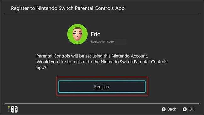 Poté potvrďte, že chcete konzolu zaregistrovat k účtu Nintendo, který jste použili k přihlášení do aplikace rodičovské kontroly, klepnutím na Registrovat.